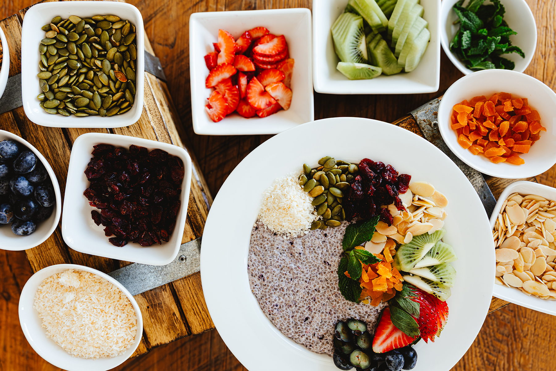The base of your protein breakfast bowl is packed with nutrients on its own. This blend of chia pudding, Greek yogurt, mixed berries, and protein powder is rich in fibre, protein, and omega-3 fatty acids. Together, these nutrients support digestive and heart health, help maintain balanced blood sugar levels, and contribute to strong bones and muscles. This base is also associated with sustained energy, hydration support, and antioxidant intake—making it a smart, satisfying choice for a healthy catered breakfast.
