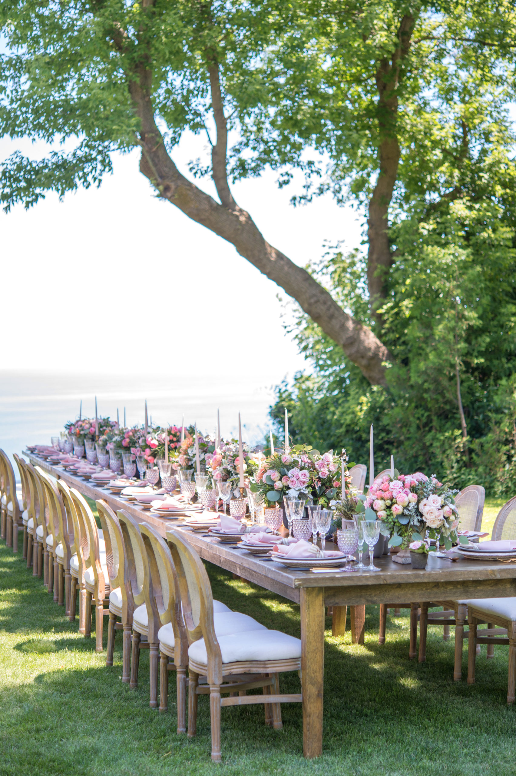 The setting was a pristine backyard edging on to the Scarborough Bluffs, one of the city’s often-overlooked natural treasures. The harvest table seemed infinite, blending into lake Ontario in the background. The weather was an outdoor wedding dream, with warm sun and cool breezes. An outdoor lounge was built under some trees for shade. When seated in the lounge it felt as though you’d been swept away to an enchanted forest. The bar was placed beneath a giant willow, with branches draping down like a waterfall backdrop. At Kiss the Cook Catering, we’re known for staging awesome backyard weddings, so this project was near and dear to us. The setting couldn’t have been more exquisite!